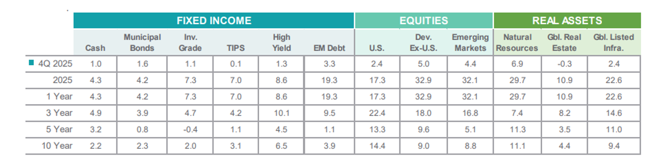 With respect to reliability, investors flocked to commodities that offer security. The price of gold soared in Q4, reaching an all-time high of around $4,550 per troy ounce on December 26. In times of macroeconomic and geopolitical uncertainty, gold is typically viewed as a hedge against inflation. Gold preserves its value due to its finite amounts and unique attributes. Investors fled to gold in 2025, leading to all-time-high prices. In fact, natural resources were the highest earner for investors in Q4 2025 at 6.9%, with developed nations coming in second at 5% (see chart above).